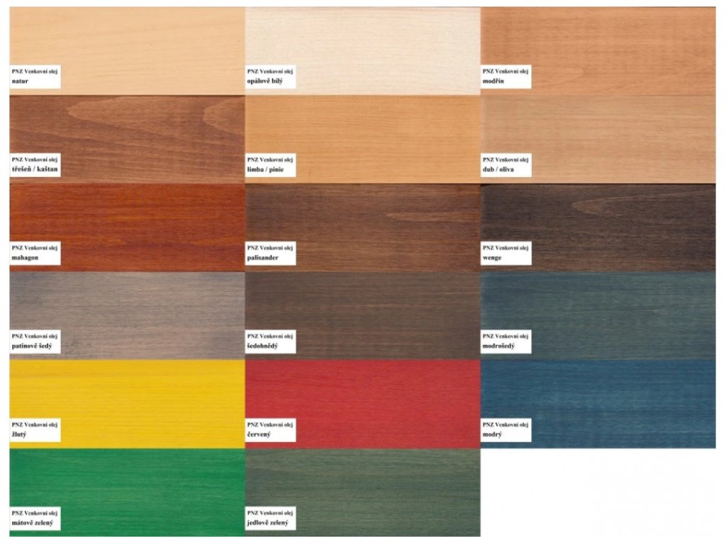 Barevný PNZ Venkovní olej je vyráběn podle staletých receptur a používá se především v exteriéru. Nátěr netvoří souvislý film a poskytuje ochranu před extrémními povětrnostními vlivy. Na rozdíl od nátěrů tvořících souvislou vrstvu, se PNZ Venkovní olej usazuje pevně v kapilárách dřeva a poskytuje tak dřevu přírodní ochranu, odolnou povětrnostním vlivům, vodě a UV záření. Zabraňuje bobtnání, vysychání a praskání dřeva. Není zařazen do žádné třídy nebezpečnosti (DIN 53160/EN 71).